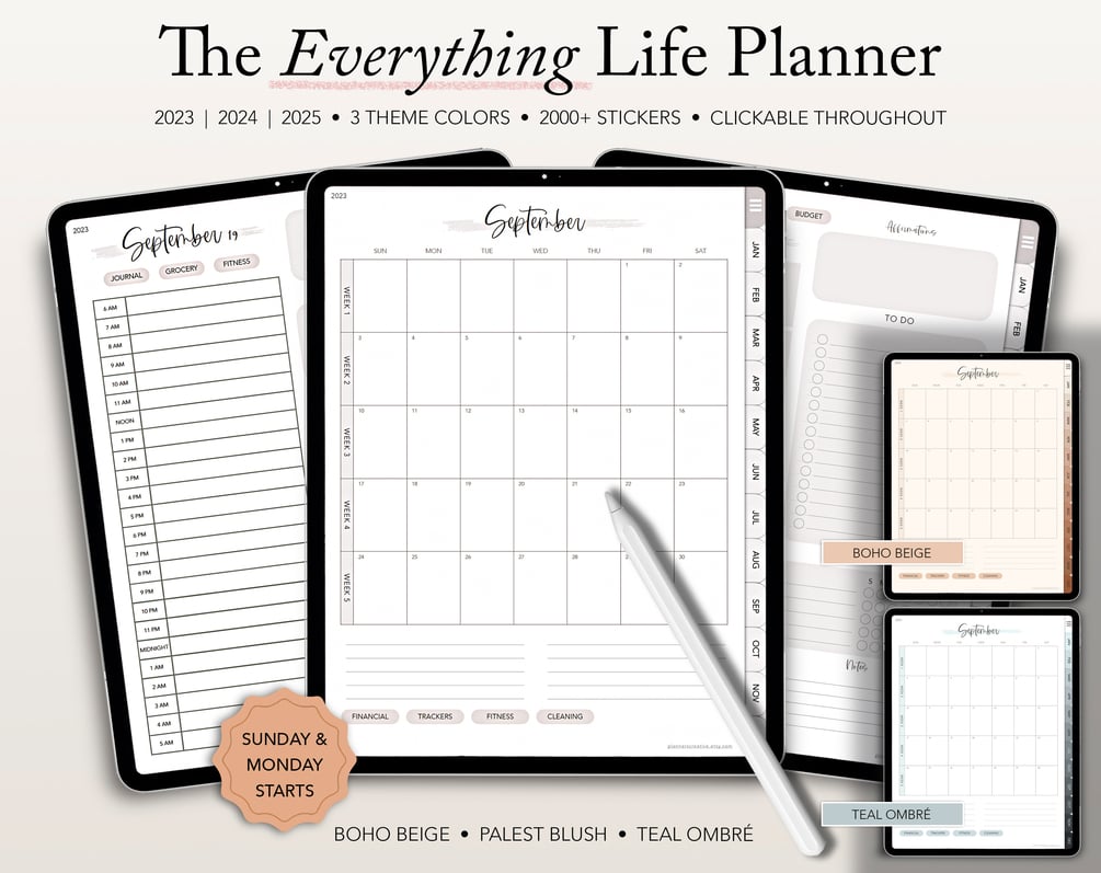 18 Planners - 6 planners per theme * Boho Beige * Palest Blush * Teal Ombré • 2023 Sunday start • 2023 Monday start • 2024 Sunday start • 2024 Monday start • 2025 Sunday start • 2025 Monday start • Each planner contains 12 Sections • Day/Week/Month Calendar • Physical Fitness • Personal Trackers • Cleaning Log • Important Docs • Vision Boards • Financial Worksheets • Budget Log • Monthly Budgeting Notes / Checklists • Emotional Wellness • Extras • Plus links to our growing libraries: 2000+ stickers • 300+ adult coloring pages