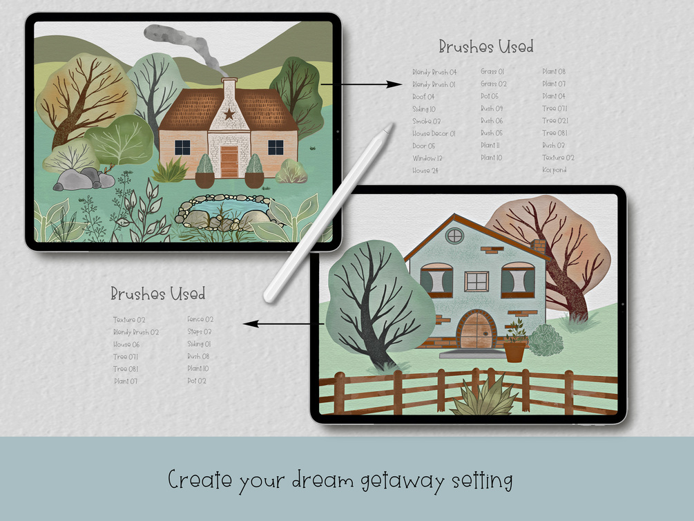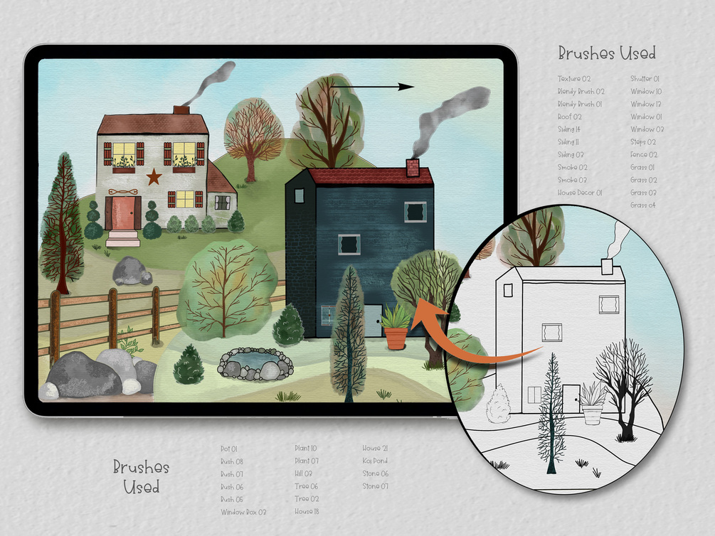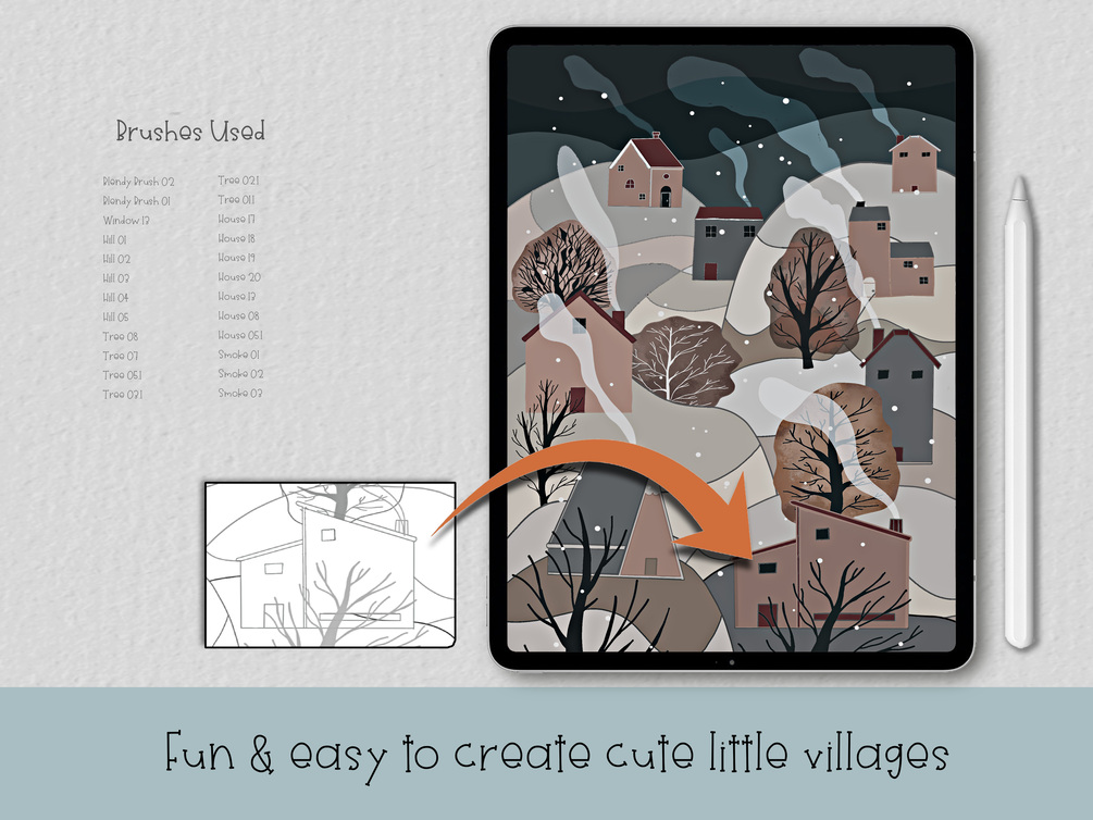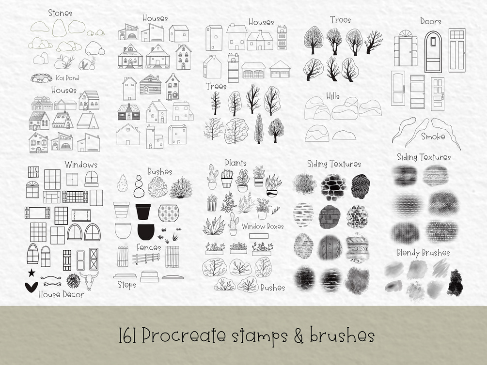 Plan out your own little neighborhood or villages with these fun, naive-inspired brushes. Includes everything you need: houses, windows, doors, siding, stones, textures, trees, bushes, plants, decor, and blendy brushes.