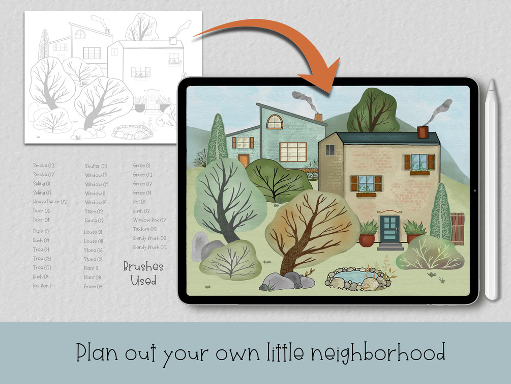 161 Procreate Happy Neighborhood Brush Set, Speed Painting, Homes, Landscape, Procreate brushes, stamps, iPad